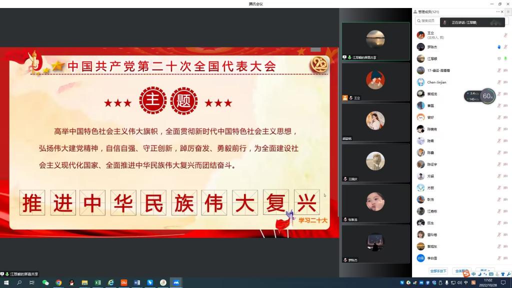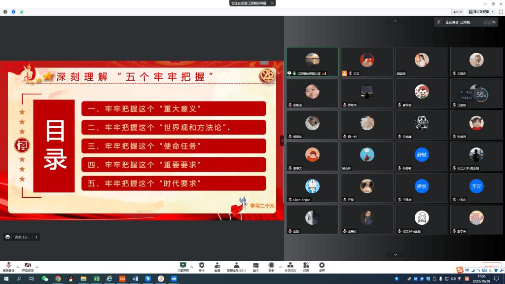 (通讯员 盛钲钦)10月28日下午4时,学院院长江厚顺在腾讯会议平台讲授“学习贯彻党的二十大精神,深刻理解‘五个牢牢把握’”形势与政策专题党课,研究生党支部书记郭冀宁、王立和全体研究生党员同志参加。