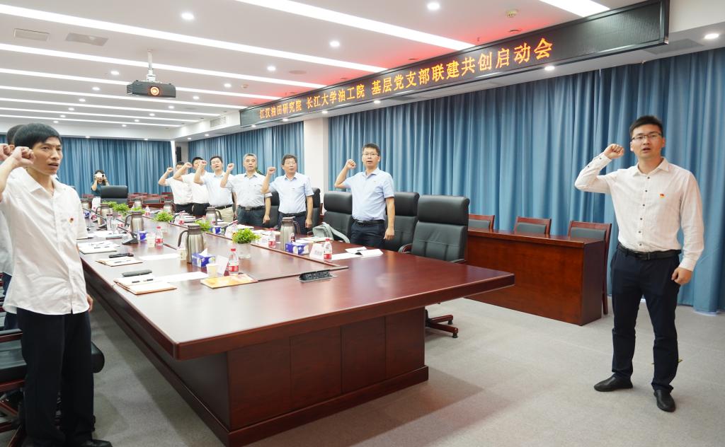 油气田开发系教工党支部与江汉油田勘探开发研究院规划研究所党支部联建共创启动会暨“牢记嘱托再立新功 产学携手再创佳绩”支部主题党日活动在江汉油田勘探开发研究院举行。研究院党委书记胡心玲、副院长荣焕青、院专家、联建支部党员代表,学院党委书记张光明、院长江厚顺、副院长李忠慧、联建支部党员代表等20余名同志参加,研究院规划研究所党支部书记康波主持。