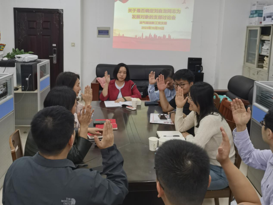 最后,与会9名党员教师全部举手表决,一致同意将刘自龙同志确定为党的发展对象,希望今后刘自龙同志继续严格要求自己,积极奉献,早日通过组织考验,成为一名光荣的中共预备党员。