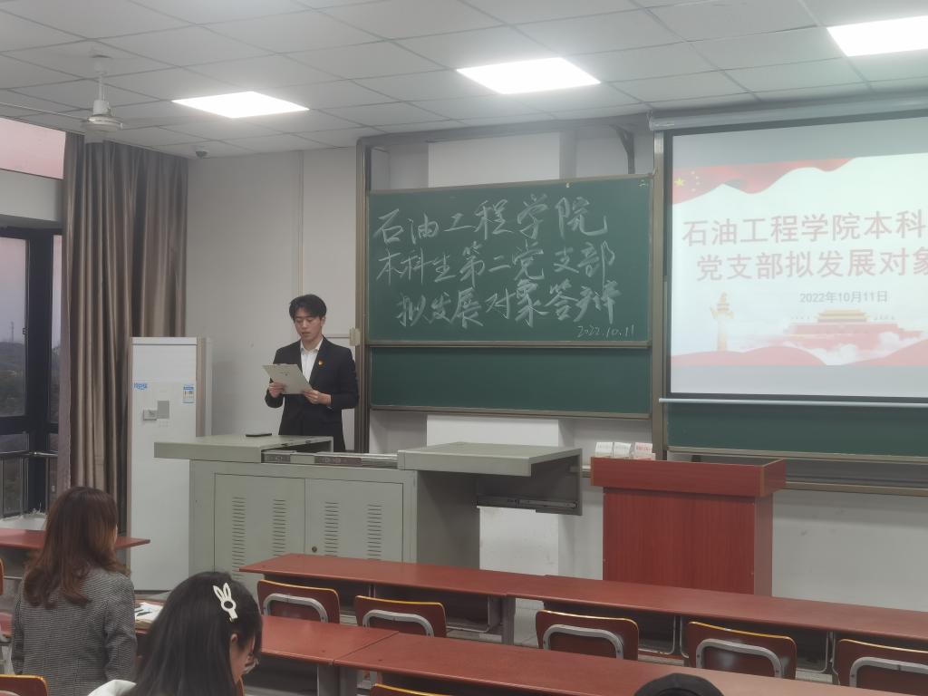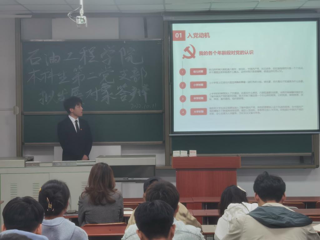 (通讯员 任堂政)2022年10月11日下午六时,福利姬 本科生第二党支部于B-402召开拟发展对象预审答辩。本次会议由支部任堂政同志主持,党委副书记刘娥老师,支部29名党员,支部16名拟发展对象参会。