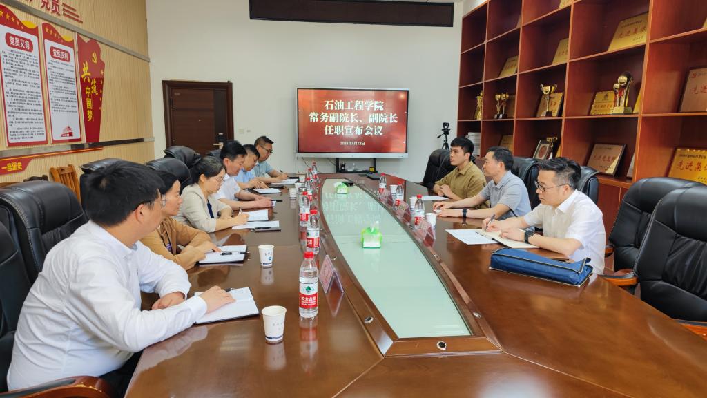 在石油科技大楼C111会议室召开干部任职宣布会议,校党委副书记敖廷华、武汉校区党工委书记崔青山一行出席会议。学院全体领导班子成员参加了会议,会议由院党委书记张伟主持。