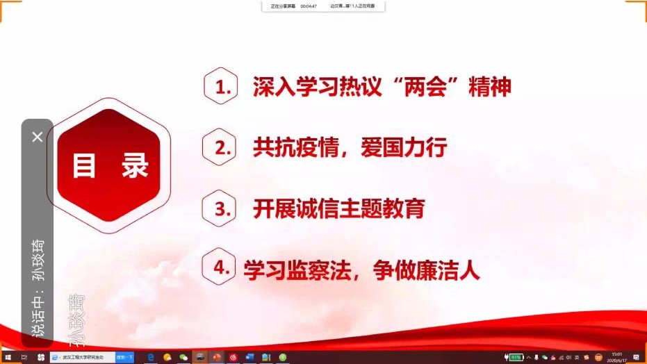 学习监察法,争做廉洁人。团支书孙琰琦首先向大家介绍了制定监察法的重要意义、监察法草案起草过程指导思想的基本思路和监察法草案的主要内容,让大家对监察法有了一个大概的了解,紧接着又为大家播放了“学习监察法,争做廉洁人”的视频专题讲座,加深大家对监察法的学习,更让大家看到了中国共产党反腐的决心,这也促使我们更积极主动地规范自己的行为,遵纪守法,做一名合格的青年大学生。