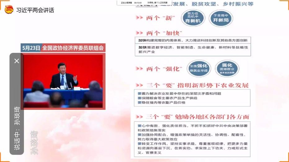 本次团会出席的有储运21703班全体同学。此次团会主要分为“深入学习热议两会精神”、“共抗疫情,爱国力行”、“开展诚信主题教育”和“学习监察法,争做廉洁人”四部分。首先,团支书孙琰琦向大家讲述了“两会”的具体含义、为什么要召开“两会”以及召开“两会”对我们的意义是什么;随后,带大家深入学习了李克强总理做的政府工作报告——今年的三个重要工作目标:没有提出全年经济增速具体目标、城镇新增就业900万以上,城镇调查失业率6%左右以及现行标准下农村贫困人口全部脱贫、贫困县全部摘帽;今年部分重要工作:包括抗疫、财政、减税降费、就业、创新、消费、投资、金融、农业、脱贫攻坚、教育、社保、开放和港澳台14个方面;紧接着带领大家学习了习近平总书记两会讲话精髓——习近平总书记先后到四个团组参加审议会议发表的重要讲话。