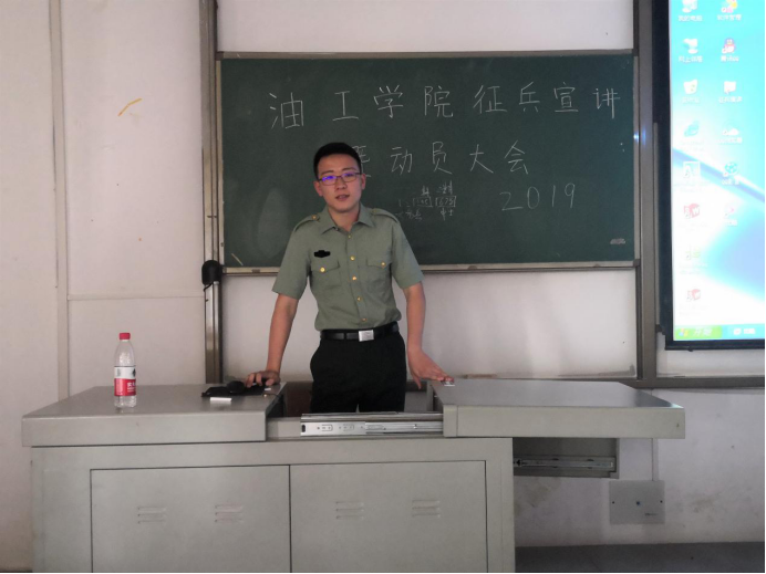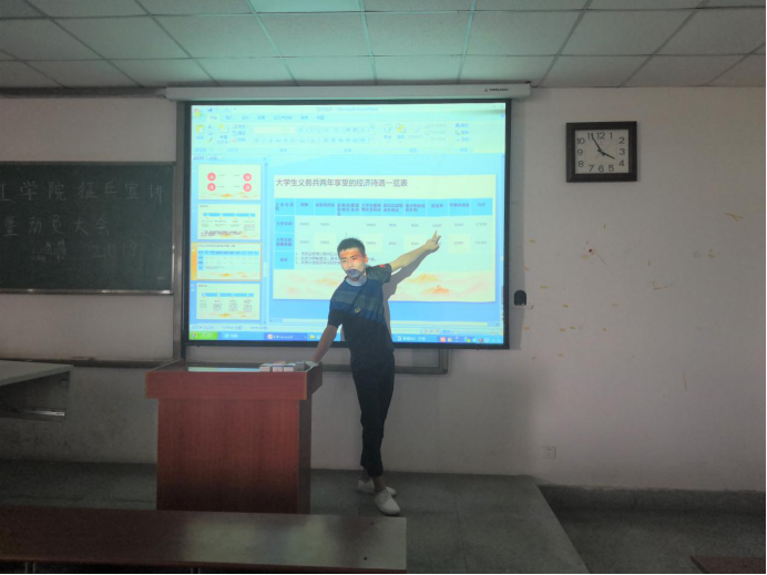 征兵宣讲暨动员大会在武教B-210进行,学工办梁军老师、史永波老师以及征兵工作宣讲员吴文杰同学、夏铭洋同学到场参加会议。