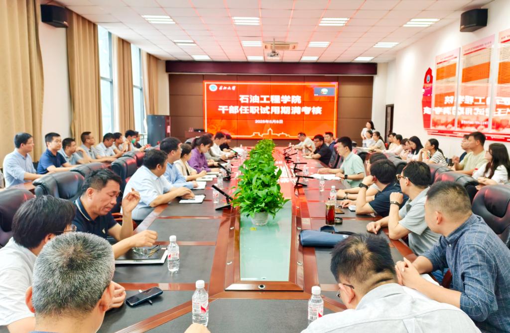 在石油科技大楼B113会议室召开干部试用期满考核暨全院教职工大会,党委组织部副部长沈谦、科长柯玮出席会议,学院党政领导班子、全体教职工参加,会议由学院党委书记张伟主持。