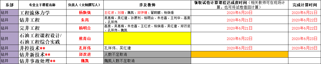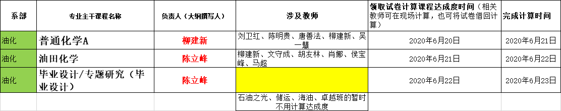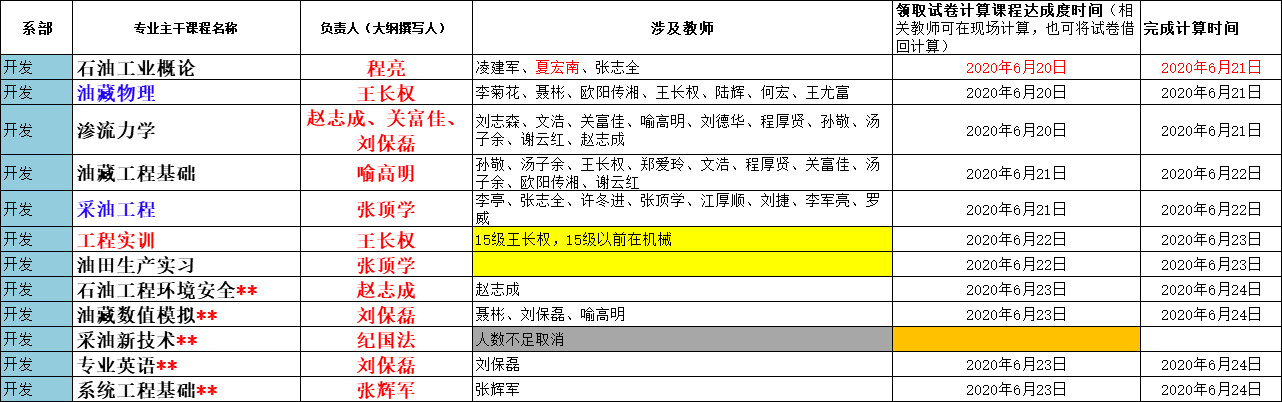 根据2020年6月16日专业认证推进会会议决定,福利姬 石油工程专业19门课程的达成度计算由相关课程任课教师负责,各系主任(钻井系熊青山教授、开发系张顶学教授、油化系付美龙教授)负责落实安排具体完成教师,完成达成度计算的截止时间为6月24日。相关课程、课程大纲撰写人、授课教师名单、领取试卷时间安排等见附件。