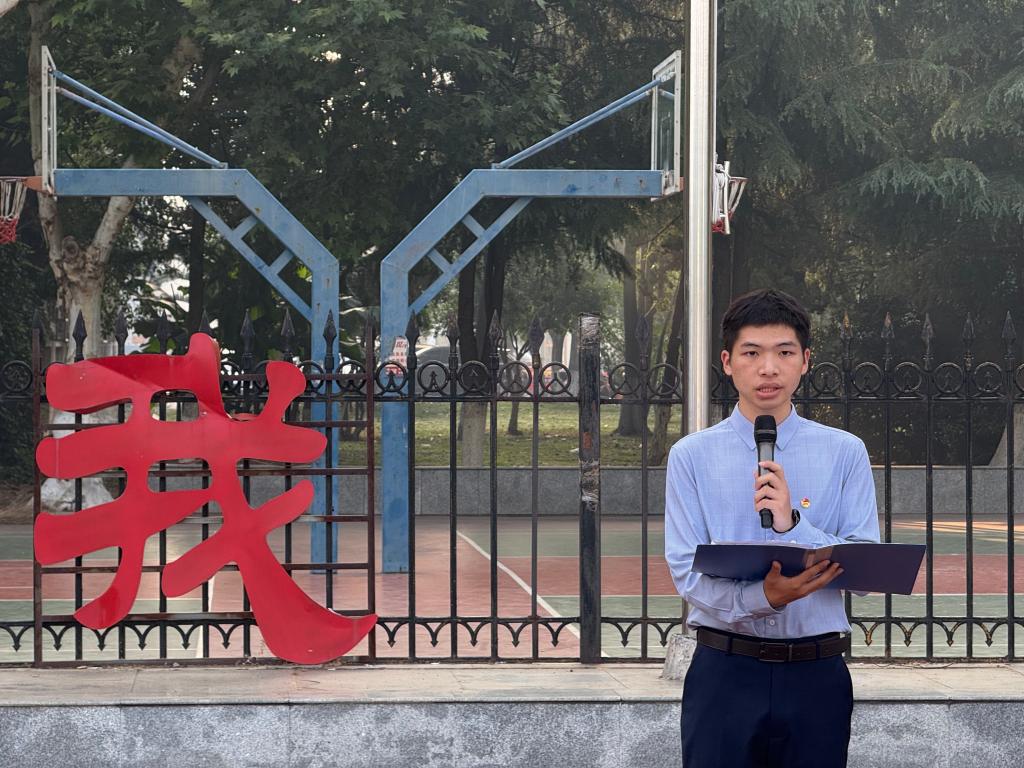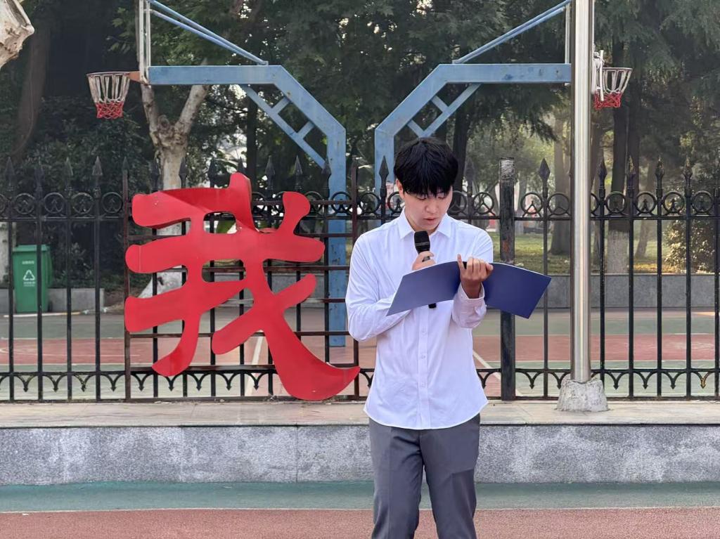 升旗仪式后,油工12402班粟思睿同学作为学生代表发言,分享了四六级备考的实用经验,并从时间管理、互助学习等方面发出倡议,号召同学们以积极态度投入复习,共同营造勤学笃行的优良学风。