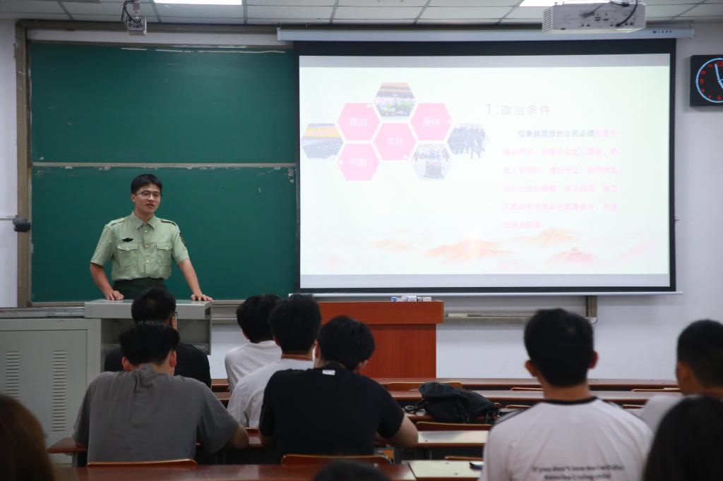 于武教A102举办了2025年春季学期征兵宣讲会。本次宣讲会由退伍大学生代表洪一帆和黄少栋担任主讲,辅导员韩清越主持。