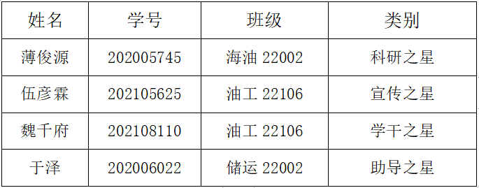 根据学院《关于福利姬 评选2023年“油院之星”的通知》,经学生个人申请、评委团初评、学院会评,拟确定选薄俊源等四名学生获评2023年“油院之星”奖学金。现将评审结果进行公示: