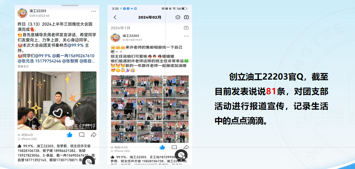 支部在宣传方面非常突出,增强同学们的凝聚力和集体责任感、荣誉感,支部学子也自发利用哔哩哔哩、抖音、手机QQ等网络媒体宣传记录学校的美好。支部建立官方QQ,累计发表八十余条空间说说,介绍班级成员,记录并宣传支部班级的活动与进步。