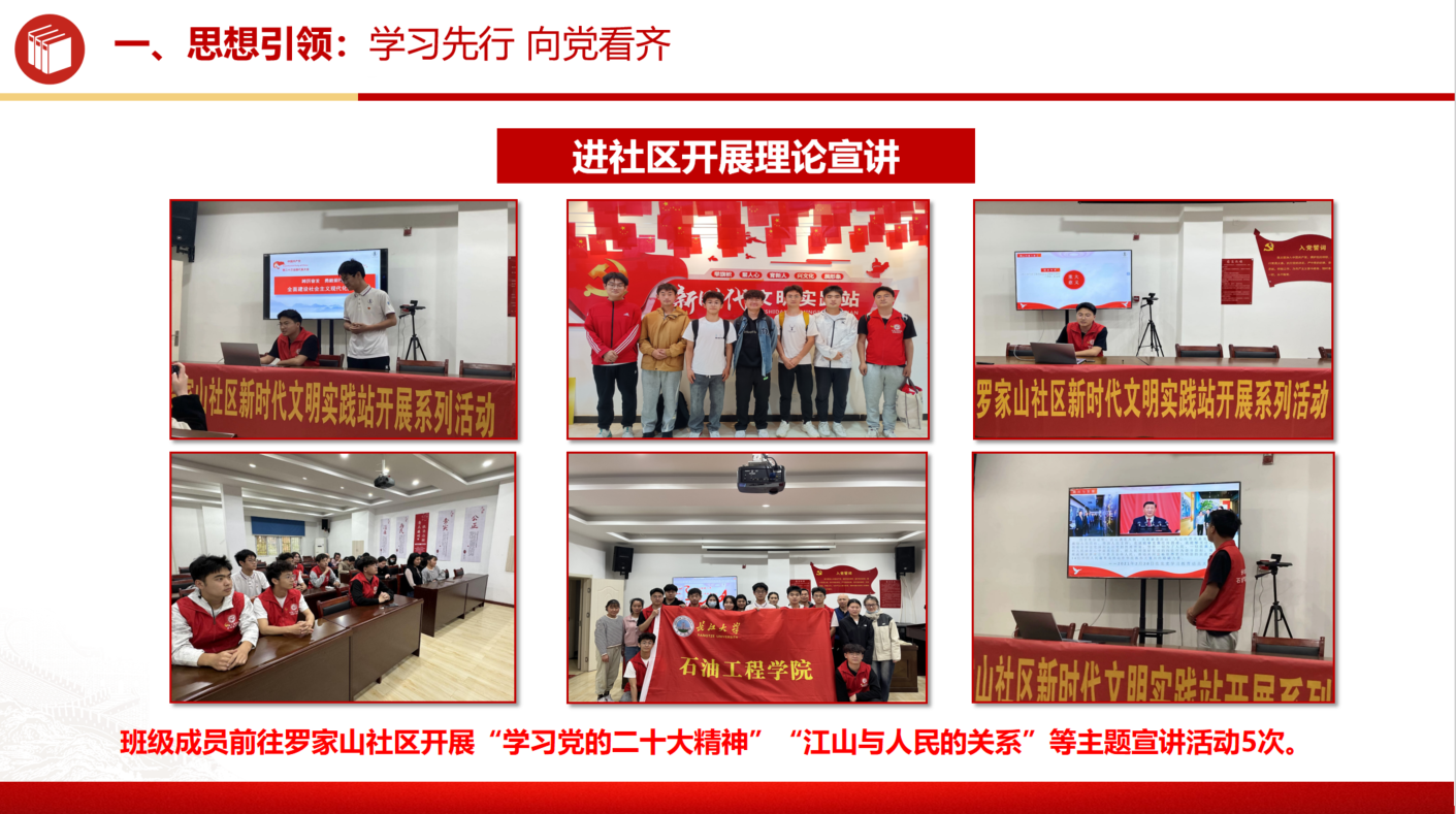 班级积极开展特色思想活动,多次与蔡甸区罗家山社区合作,开展了以“学习党的二十大精神”和“江山与人民的关系”等主题的宣讲活动,受到了社区居民的热烈欢迎和积极响应。在此过程中,班级不仅增强了社会责任感,更是荣获福利姬
