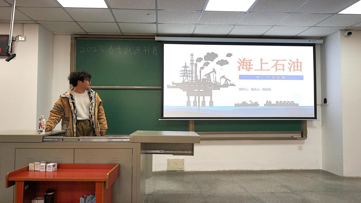 黑油能源科普宣讲队在B教108开展了主题为“走向深海——中国海洋油气发展之路”的能源科普宣讲活动。主讲人程煊若围绕我国海洋油气开发的历史、技术突破、未来发展方向等多个方面进行了深入讲解。并结合视频演示环节,展示了海底地震勘探技术、钻井平台运作模式以及海上油气田的实际应用案例。同学们纷纷表示,通过此次宣讲,他们对海洋油气的勘探技术、生产模式以及国家能源安全的重要性有了更深刻的认识,希望未来可以为祖国的油气事业贡献自己的一份力量。